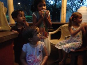 Pendant la promenade au matrimandir, on c’est fait surprendre par une belle averse! Et bien sur, les enfants ont trouvé ca top!