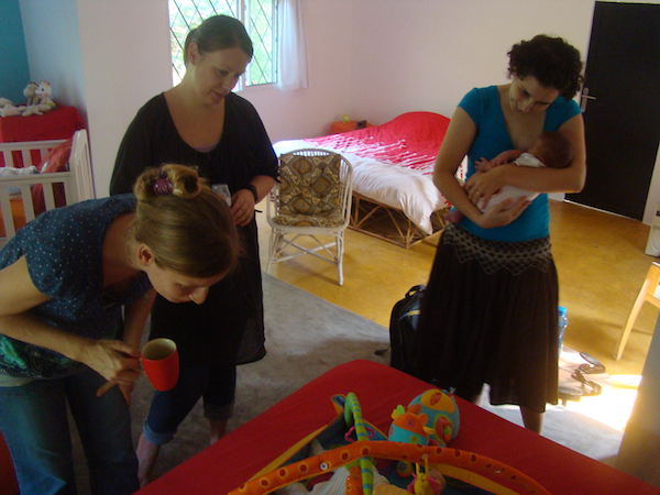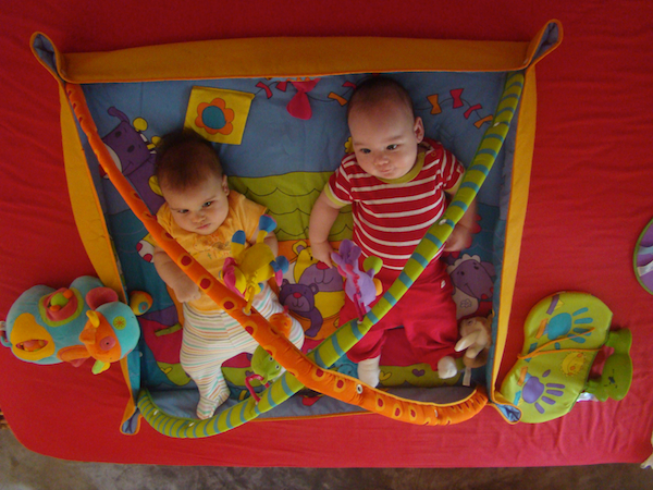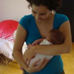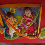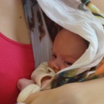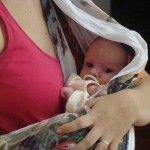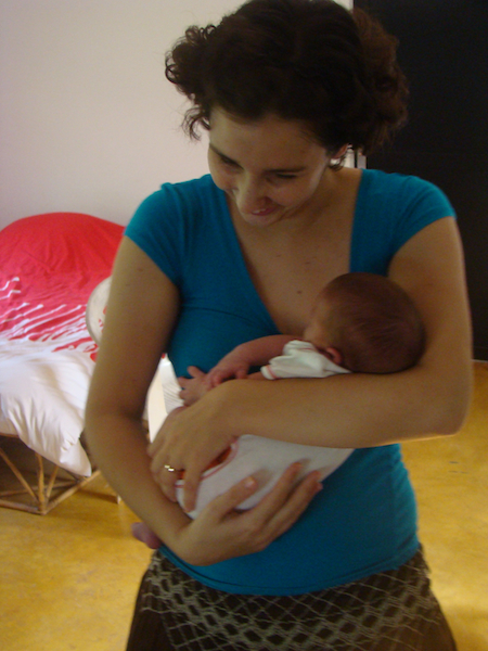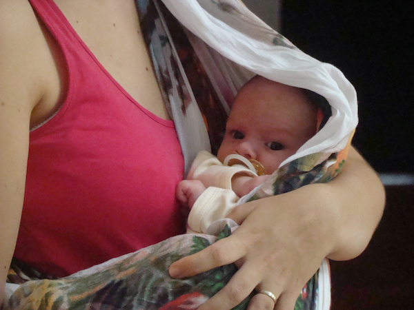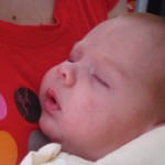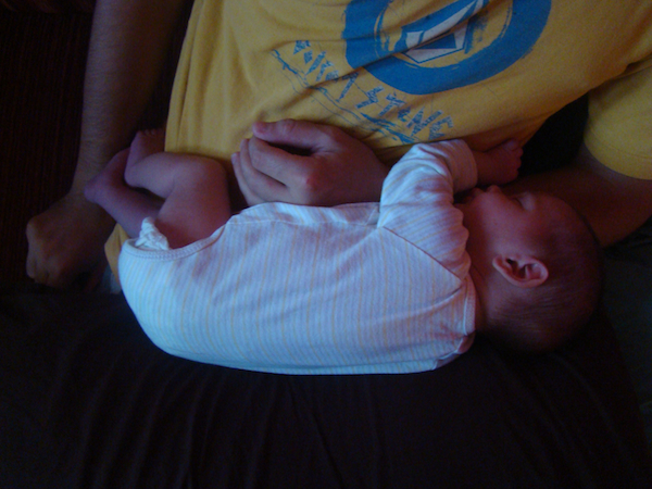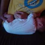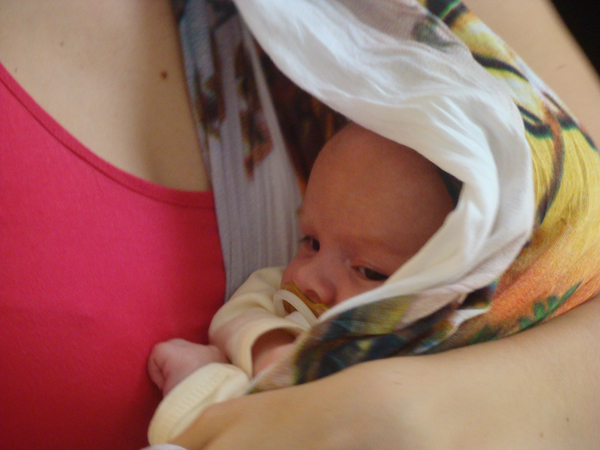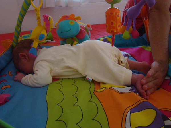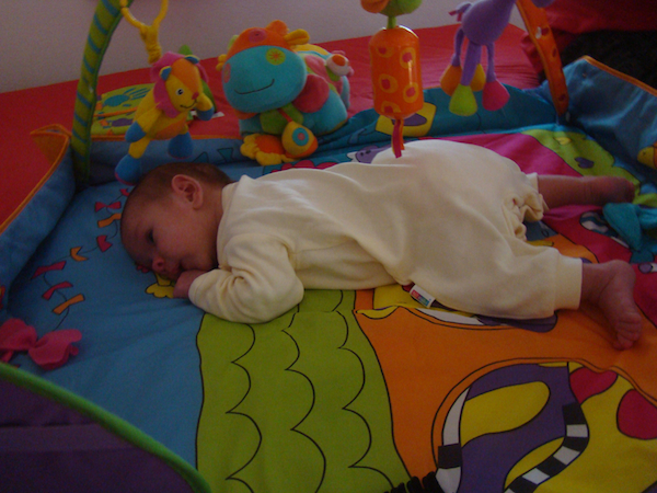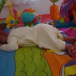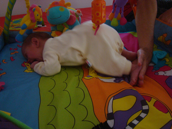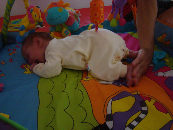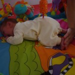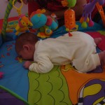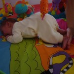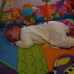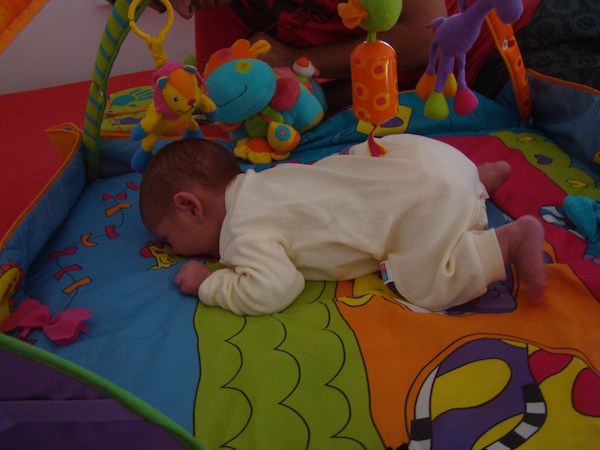 Il est de plus en plus éveillé, tient beaucoup mieux sa tête et donne des coups de pied et de main de plus en plus fort!