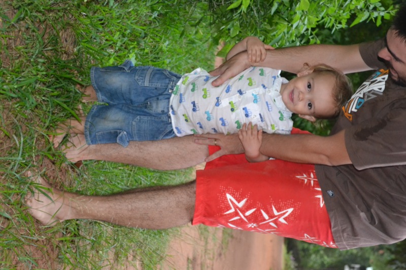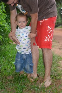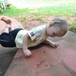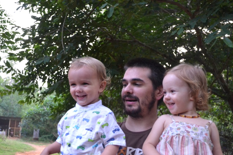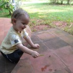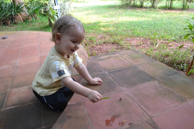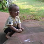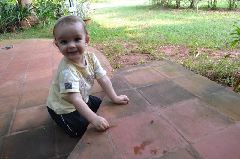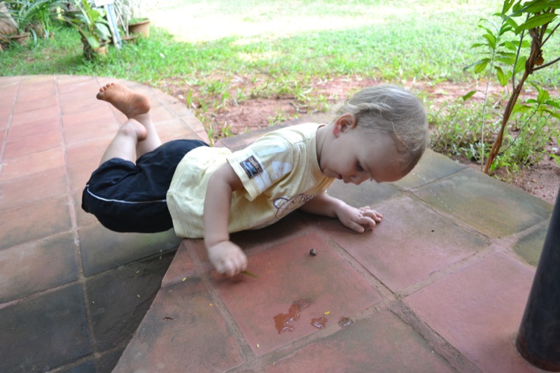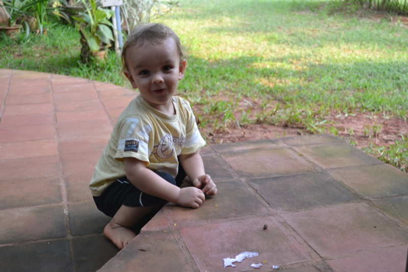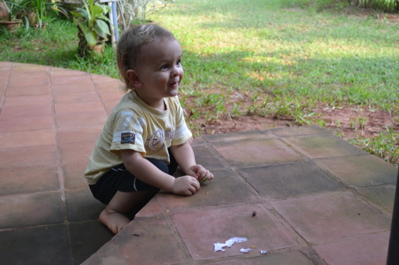 Un moment, il joue avec une grenouille dehors, puis tout d’un coup il rentre en courant: ‘A peur de la grenouille!’. Il a peur des serpents dans l’herbe, des singes dans les arbres…. Ça ne dure que 5 minutes, mais on l’entend de plus en plus. L’autre jour, le pain qu’il mangeait avait peur de la moto, il a dû aller se cacher dans le sac à Maman…!