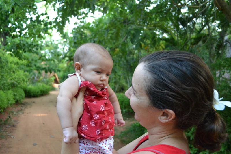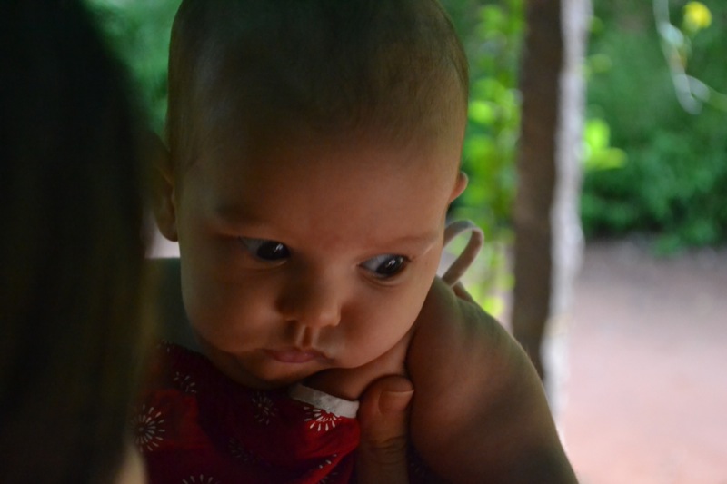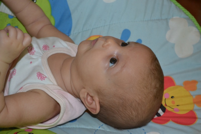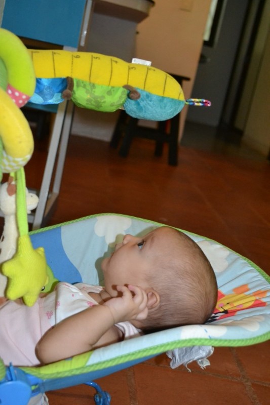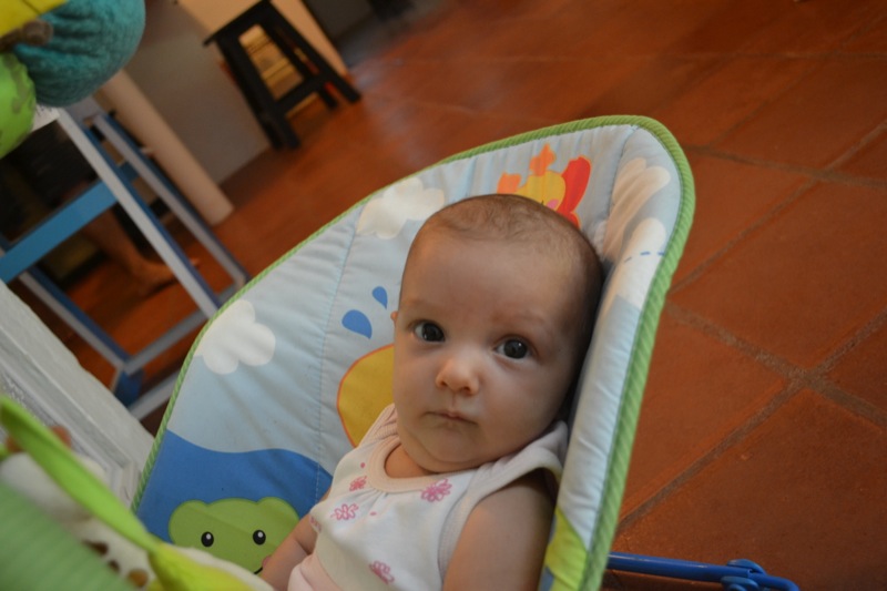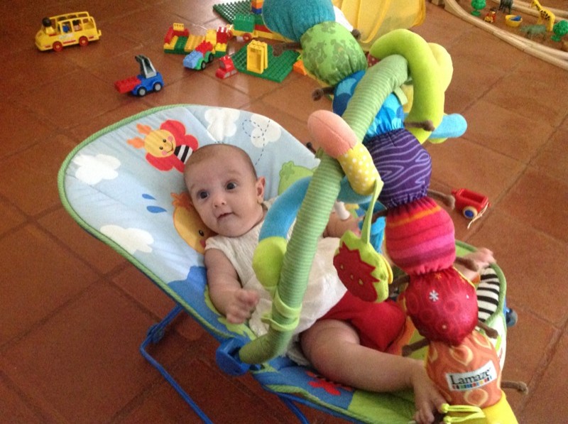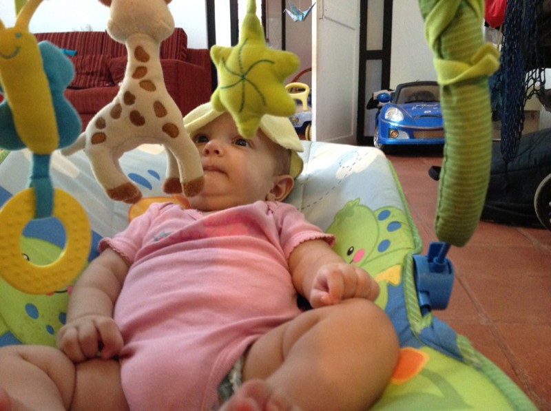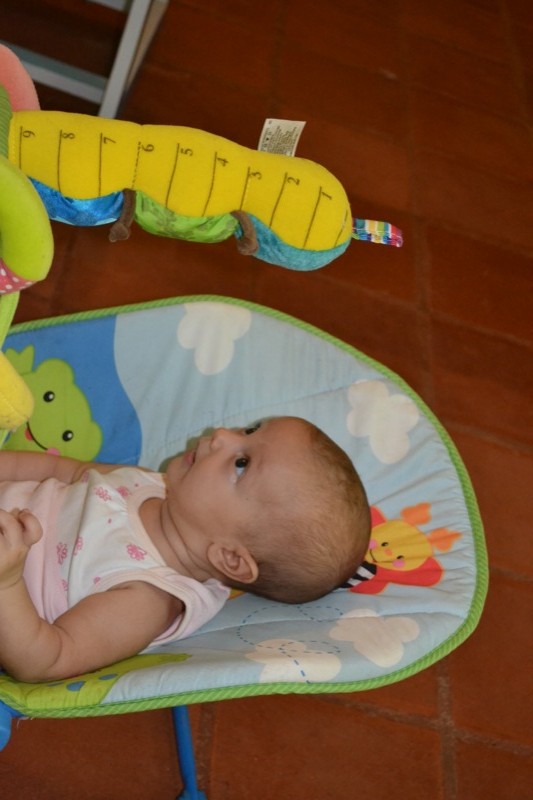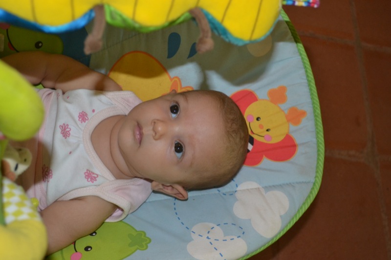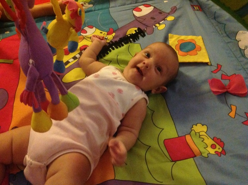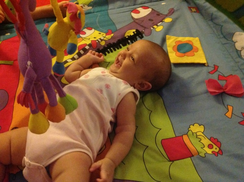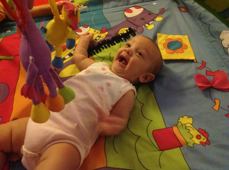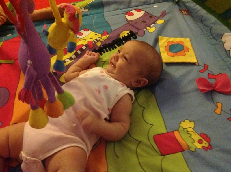 Elle nous sourit dès qu’on lui parle, commence a rire et parle a longueur de journée! Elle fait des petits cris aigus qu’on n’avait jamais entendu avec Milo, c’est assez drôle!