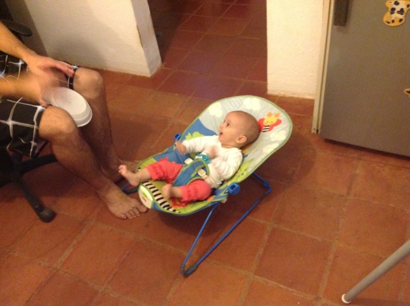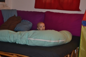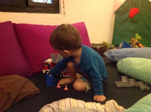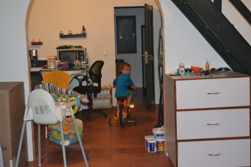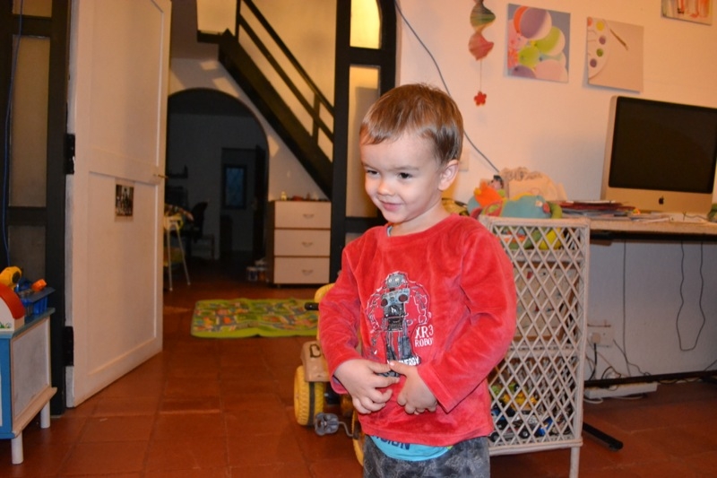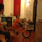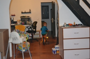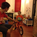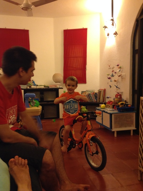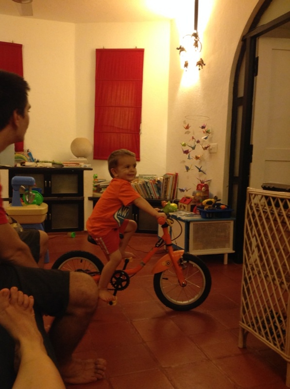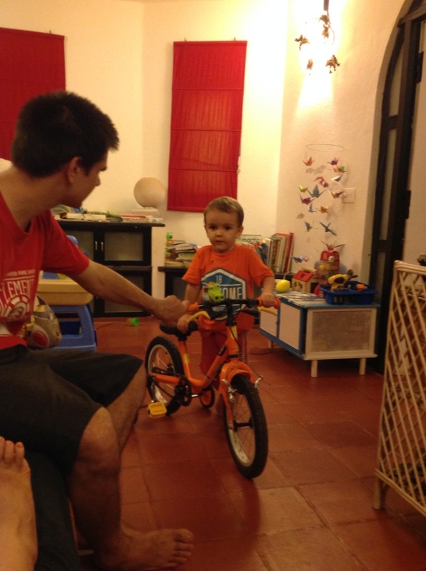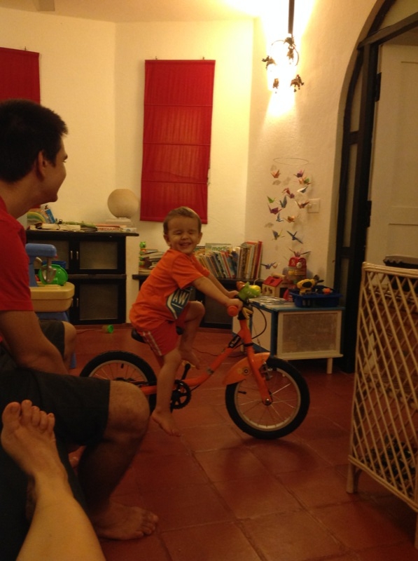 Milo adore son vélo, il vit dessus! Comme il pleut encore régulièrement, on garde le vélo dedans et Milo ne se déplace plus sans… C’est l’heure de la douche? Hop, il va dans la salle de bain en vélo, puis on repart dans la cuisine… Si il pouvait, il l’amènerait avec lui dans sa chambre!