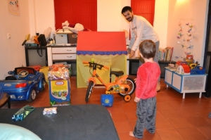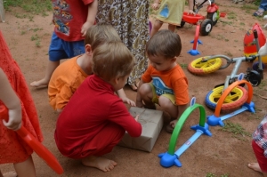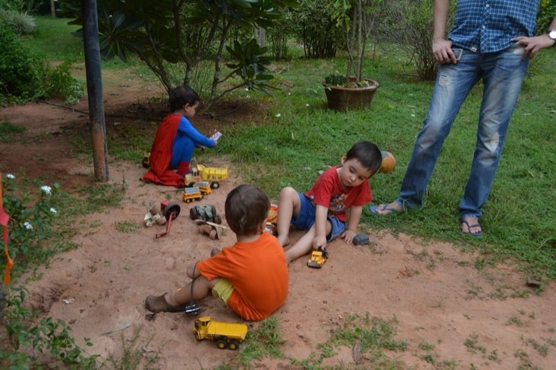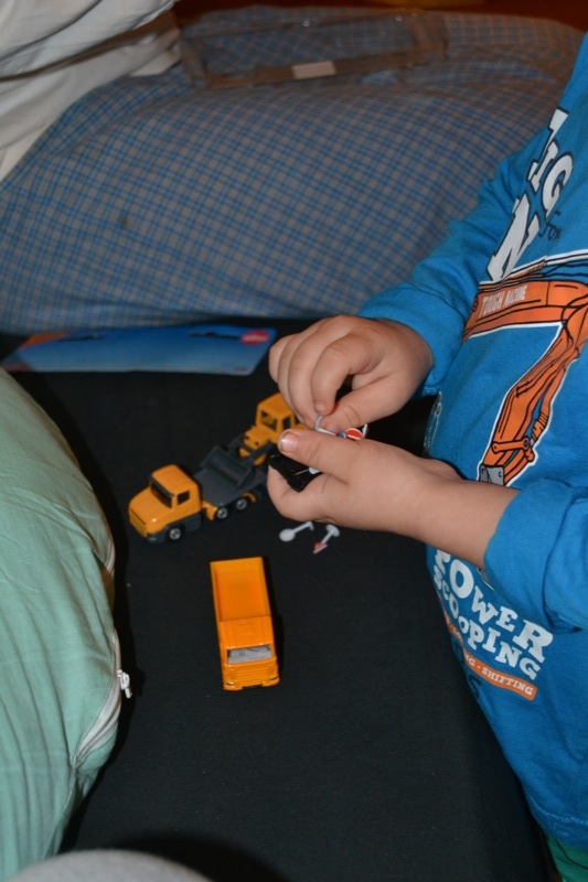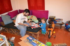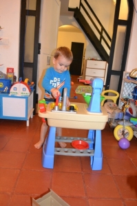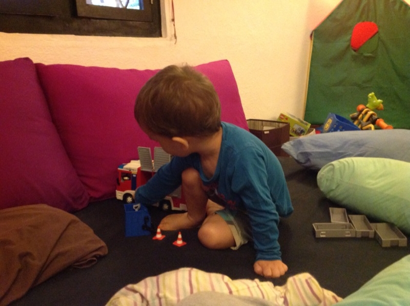 Quelques petites voitures, des puzzles, des livres, un super camion de pompiers playmobile et une cuisine d’extérieur…