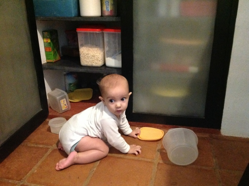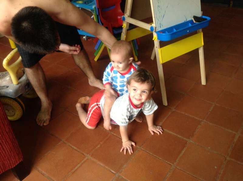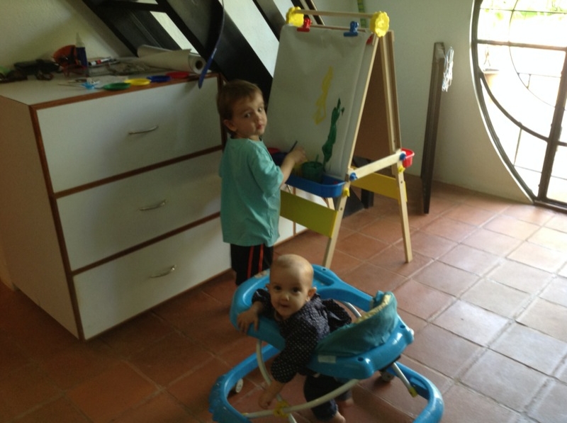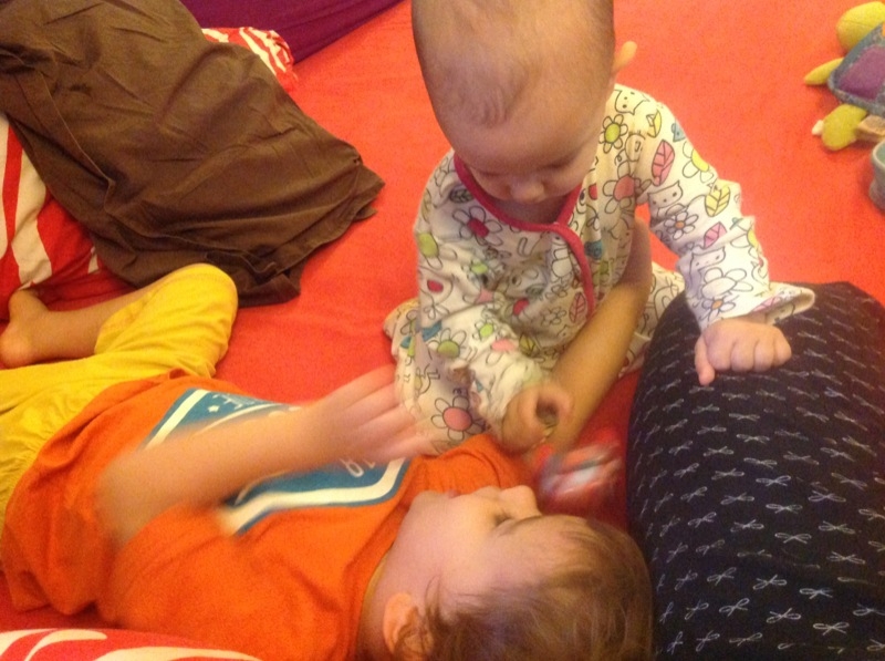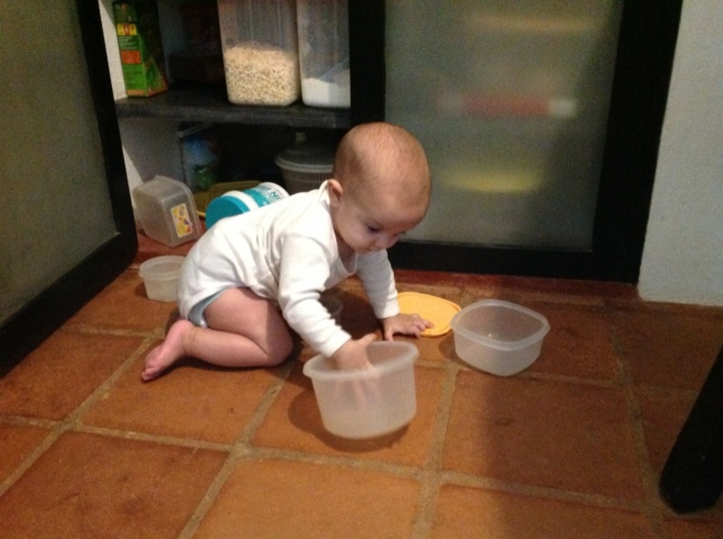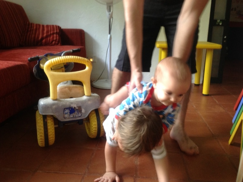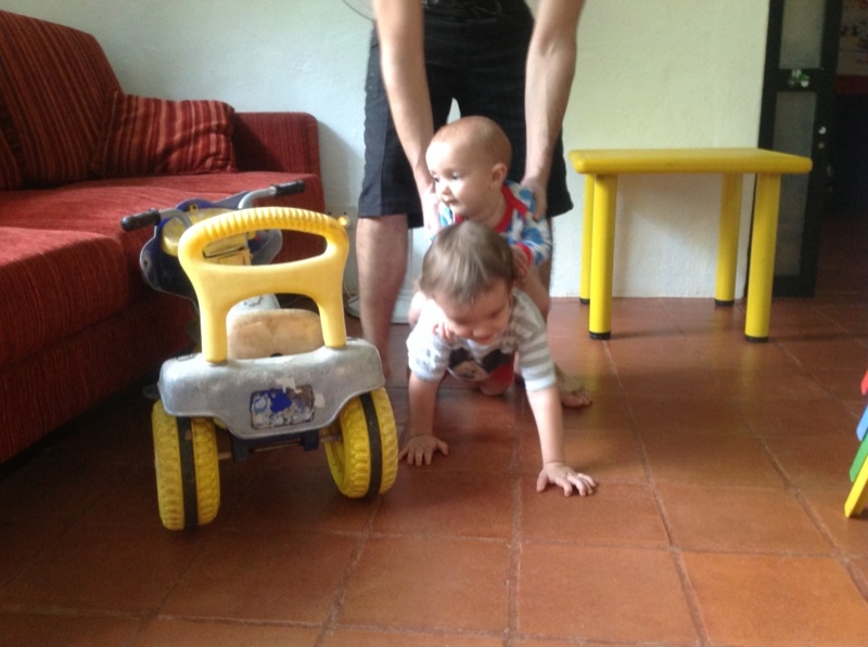 Elle marche maintenant très bien a quatre pattes et court dans le trotteur. Son jeu favori est de courir après son frère pour l’attraper!