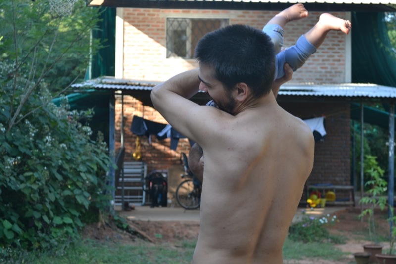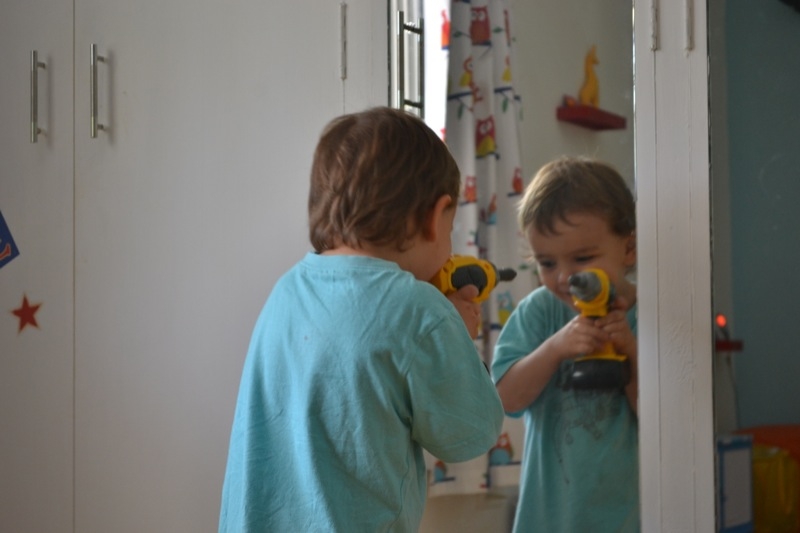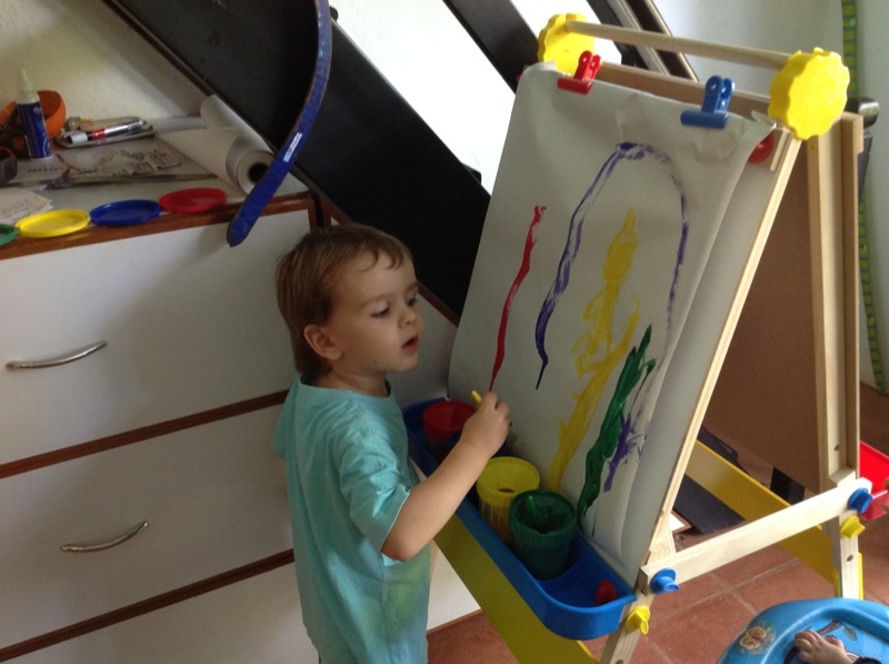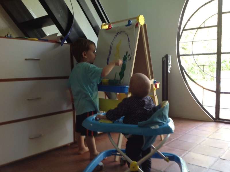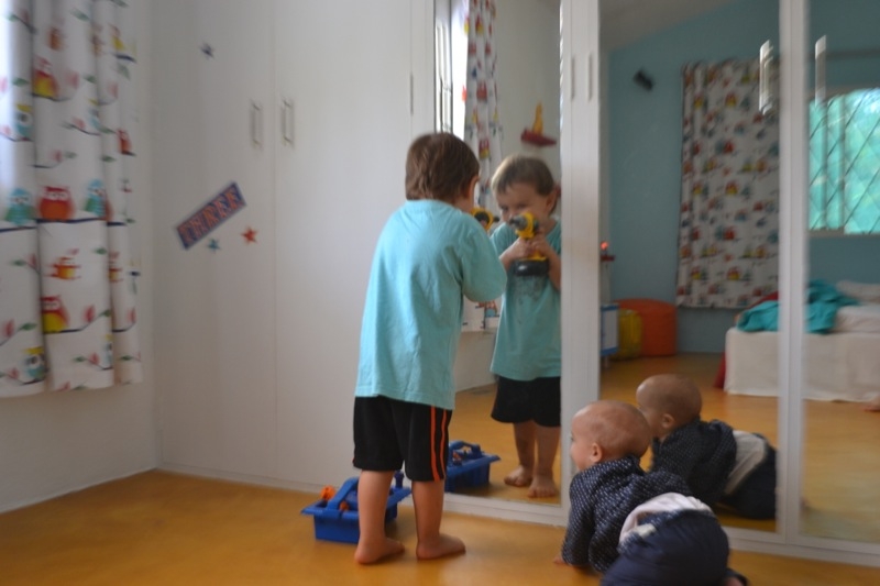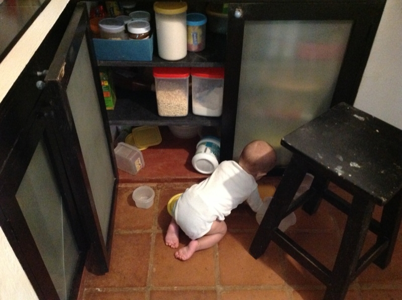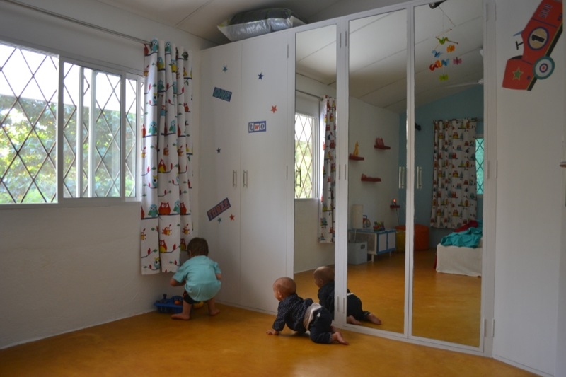 Elle marche maintenant très bien a quatre pattes et court dans le trotteur. Son jeu favori est de courir après son frère pour l’attraper!