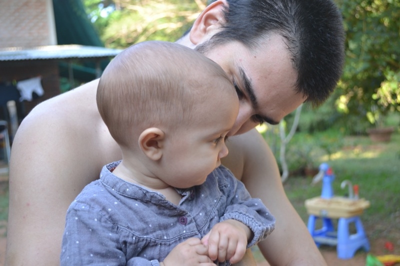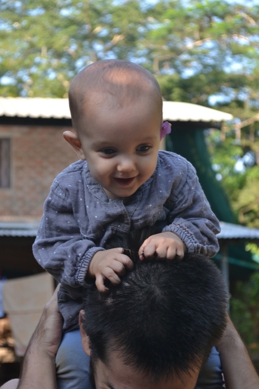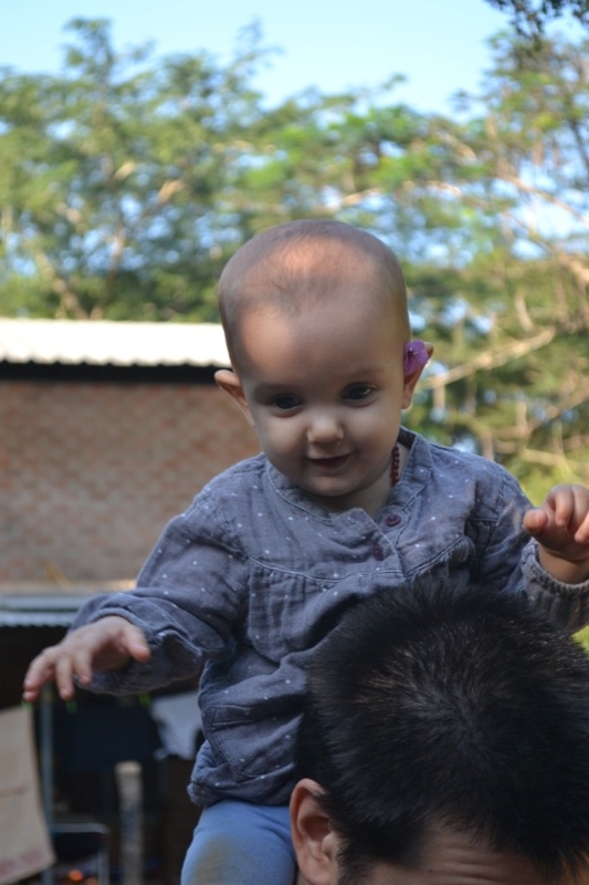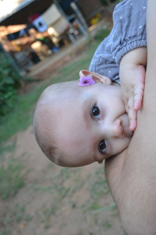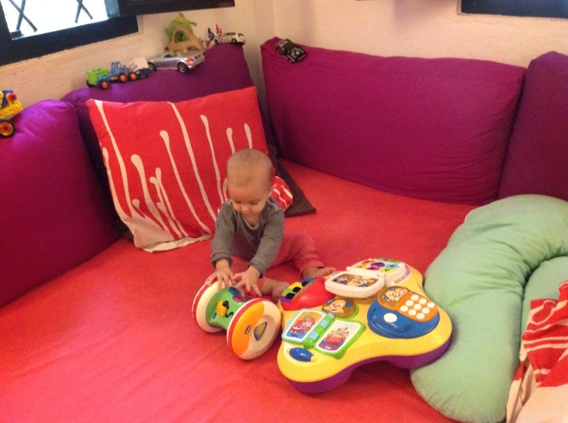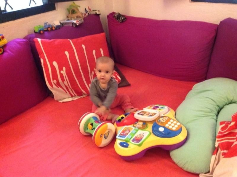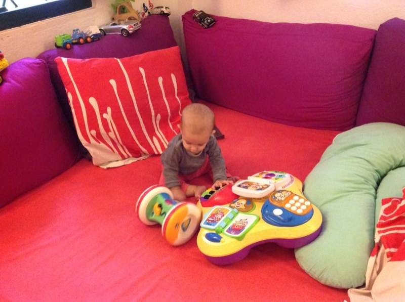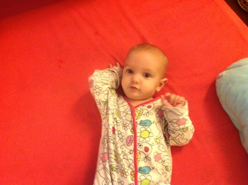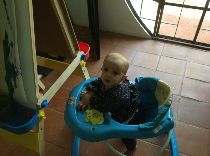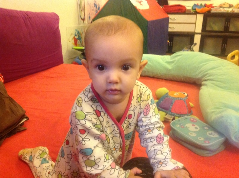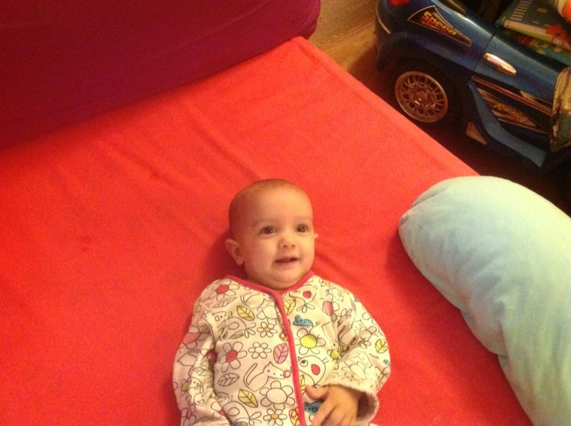 Elle aime se mettre debout et tiens quelques instants sans tomber. Elle est assez bavarde et on entende beaucoup de bababa, papapa, mamama en ce moment.