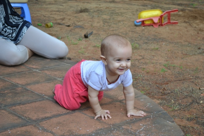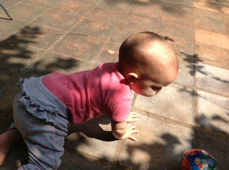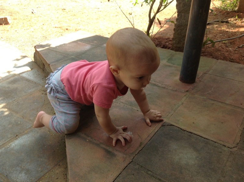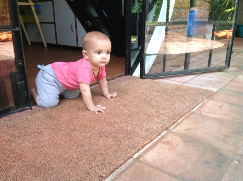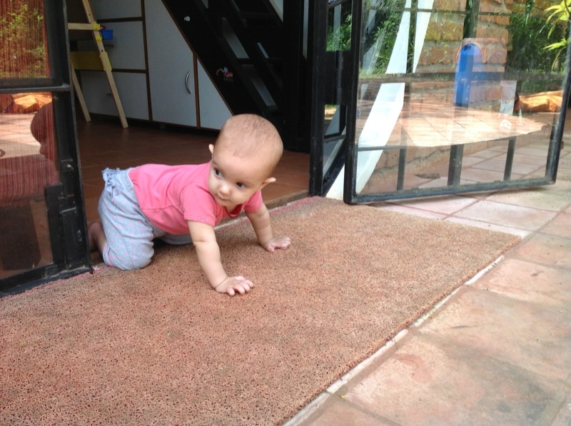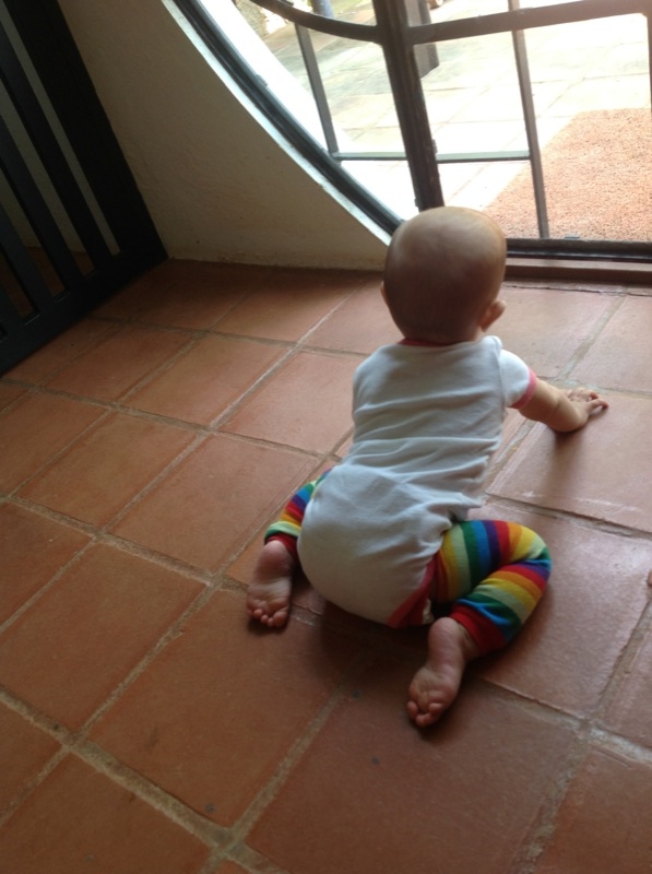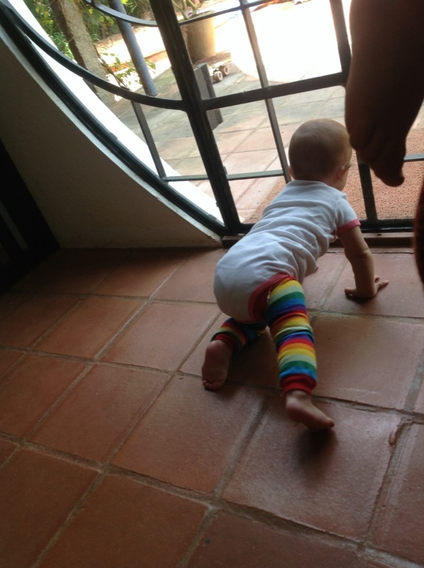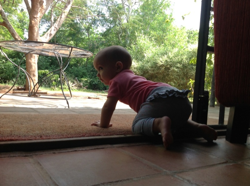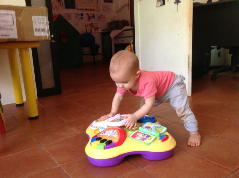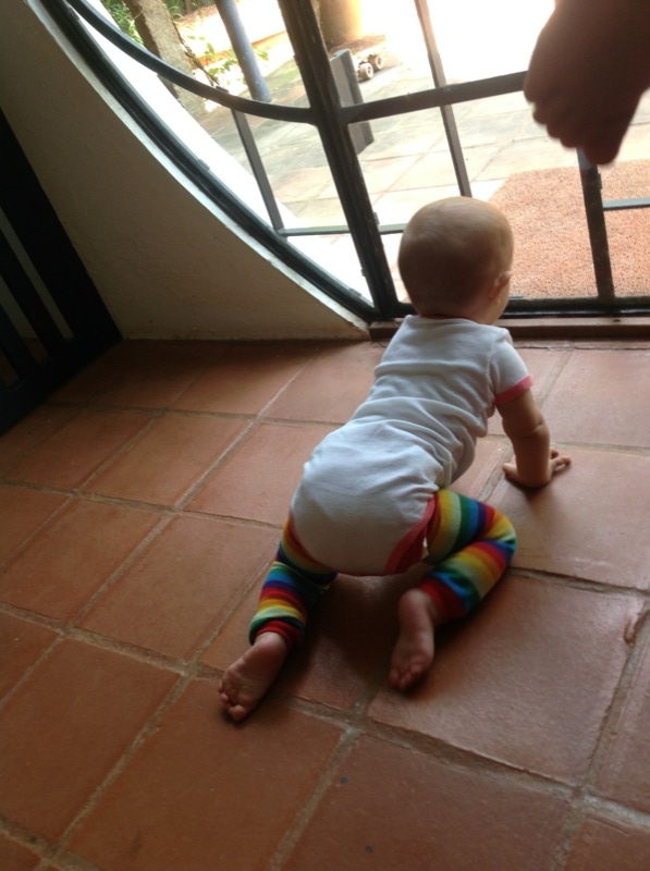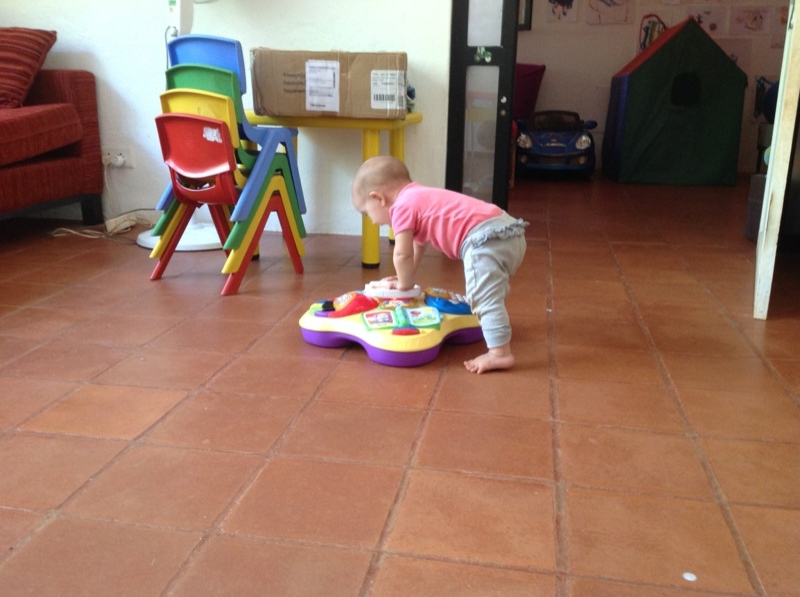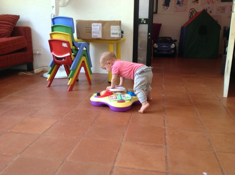 Ca y est, Sienna a sa première dent! A 9 mois et demi, elle s’est fait attendre… Pas de photo de la dent pour l’instant, mais voila Sienna dans sa position préféré du moment: elle essaye de se mettre debout tout le temps!