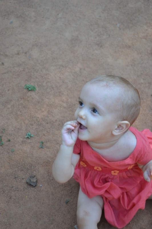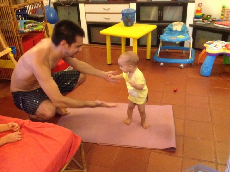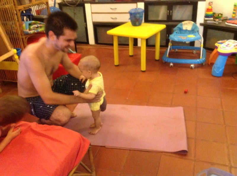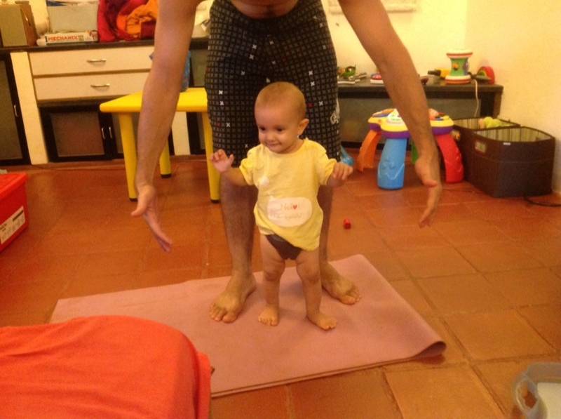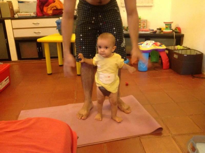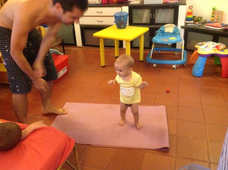 Elle fait quelques pas ici et la, mais n’a pas l’aire pressée de marcher toute seule. Comme son frère, elle marche sur la pointe des pieds!