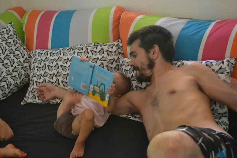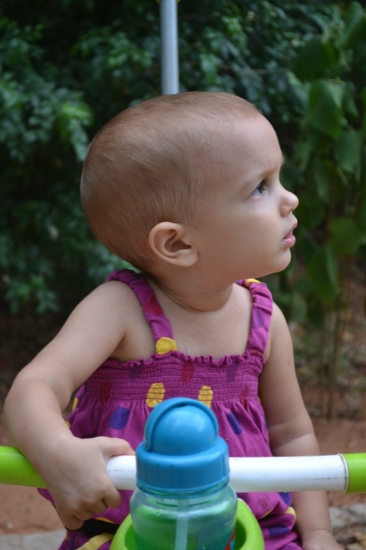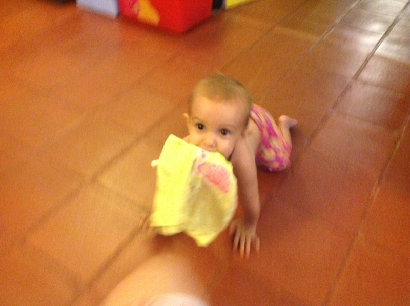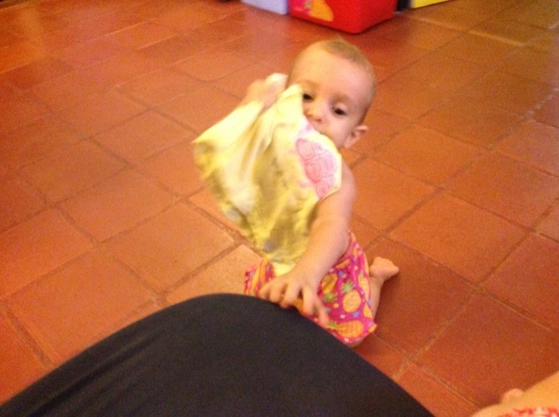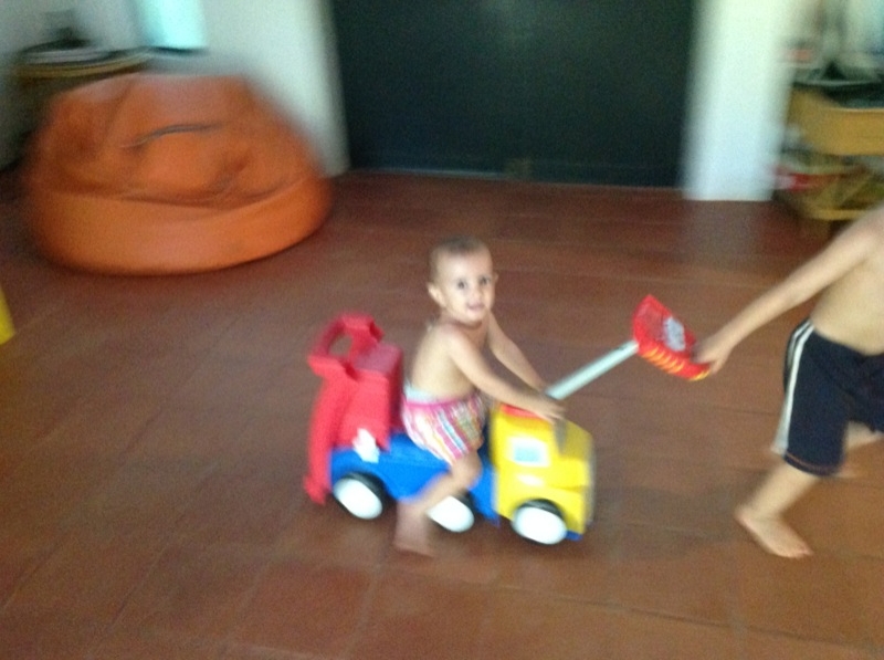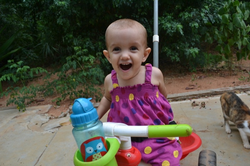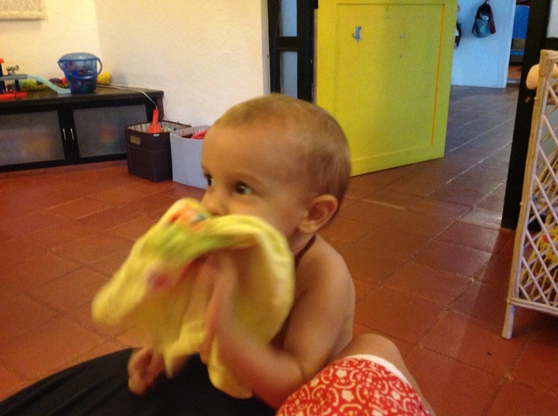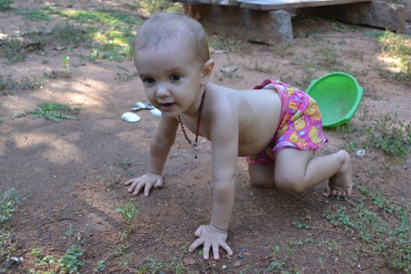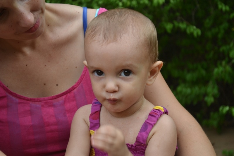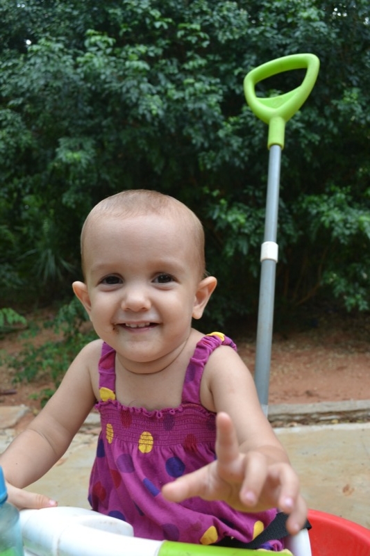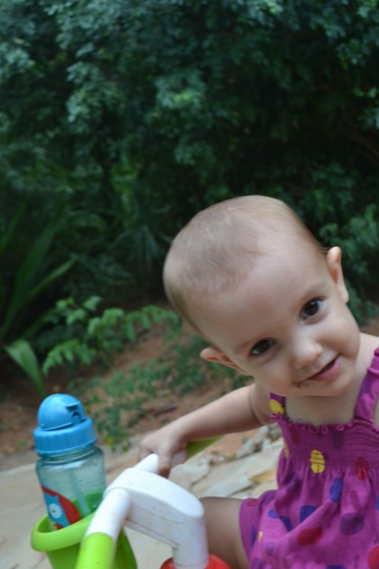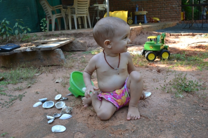 Elle parle aussi de plus en plus, et son dernier mot est ‘tracteur’! Etonnant non? C’est bien la soeur de Milo! Elle dit aussi ‘de l’eau’, ‘this’ (en pointant avec son petit doit), baloo (pour chien), tête… Et comprend tout ce qu’on lui dit!