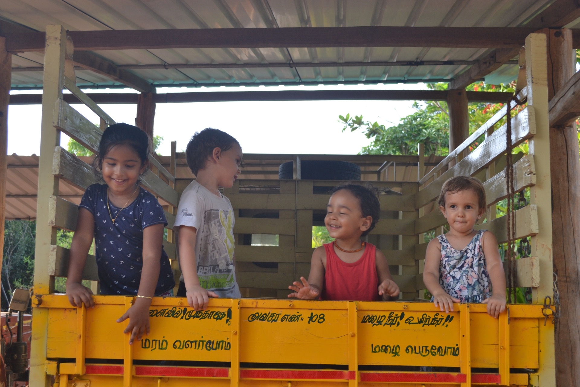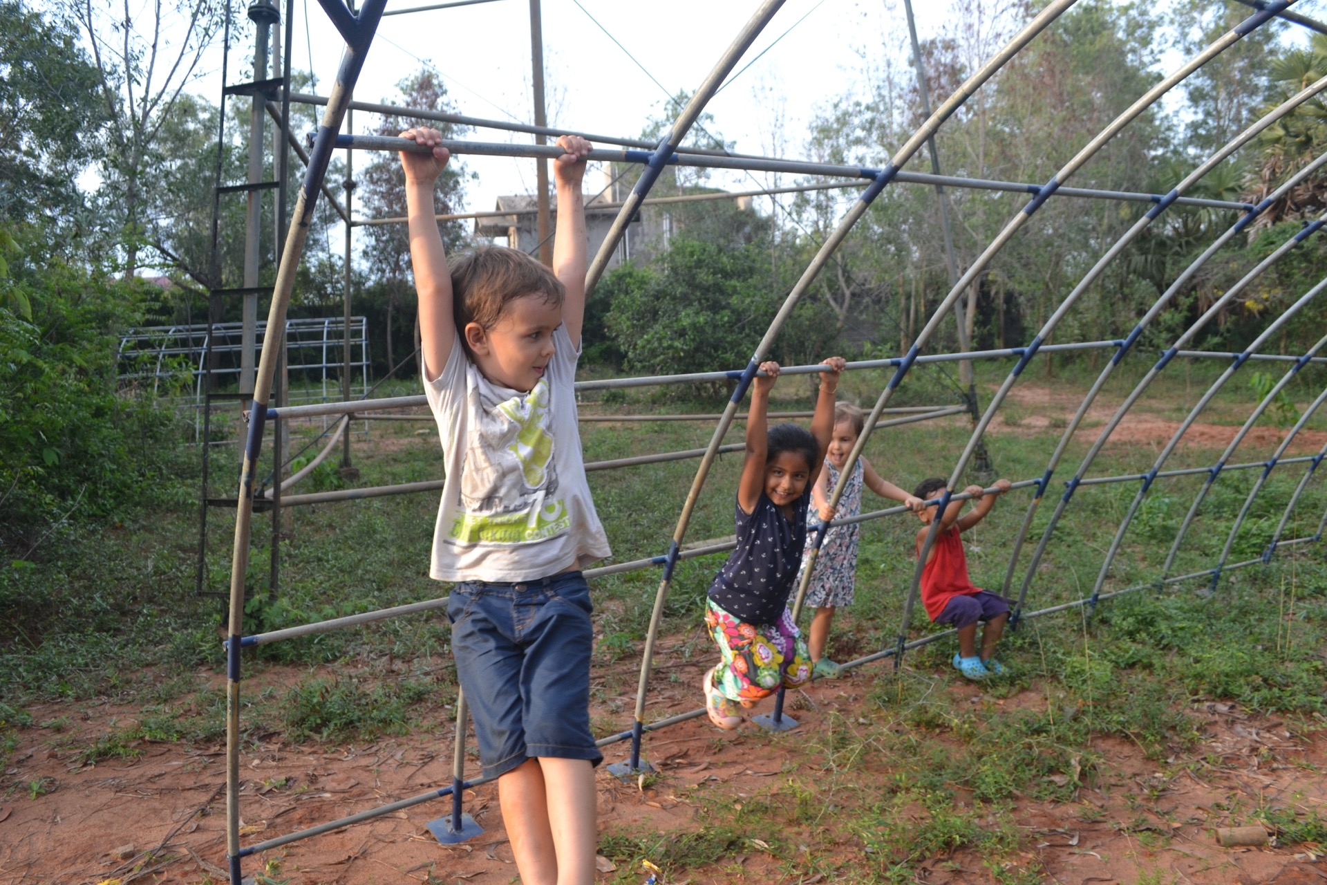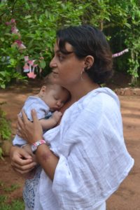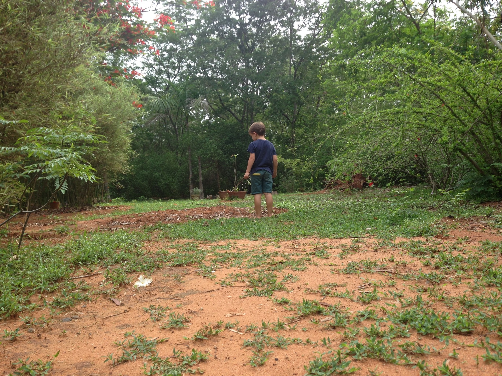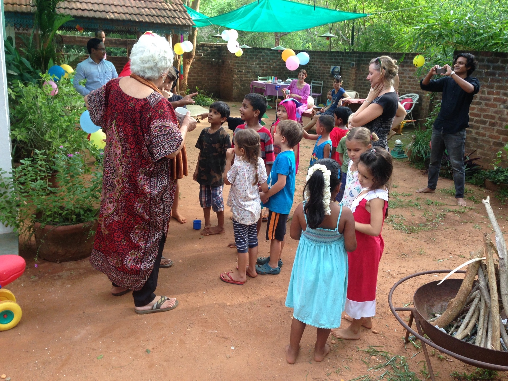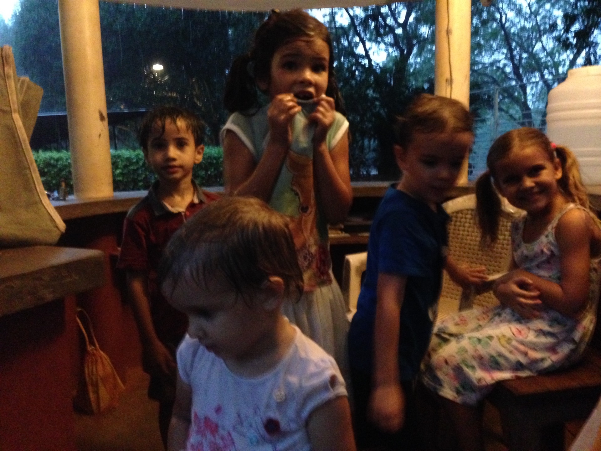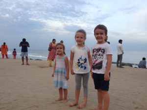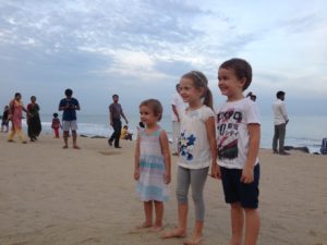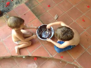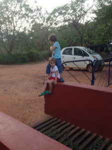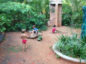 Pendant la promenade au matrimandir, on c’est fait surprendre par une belle averse! Et bien sur, les enfants ont trouvé ca top!