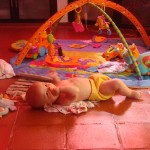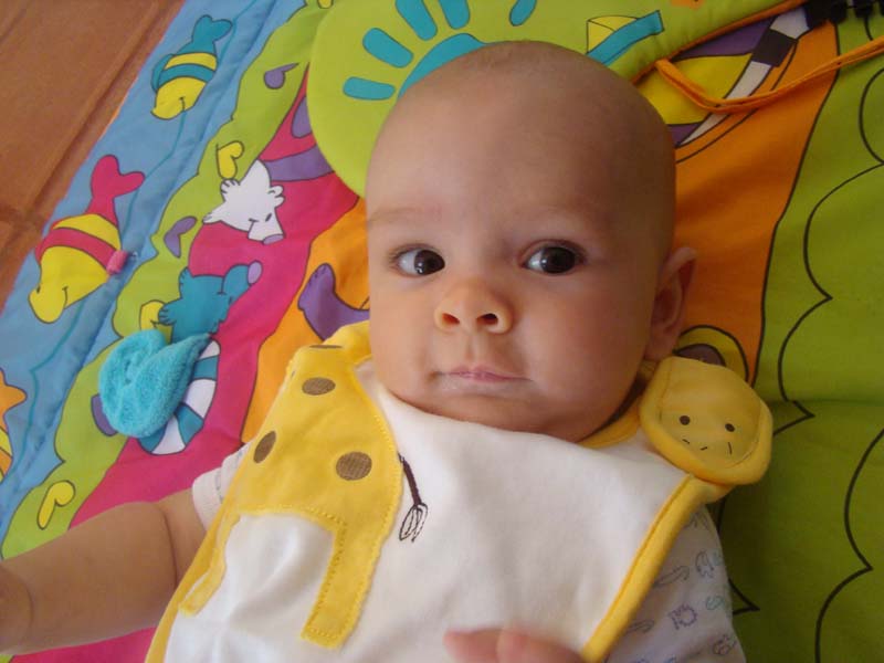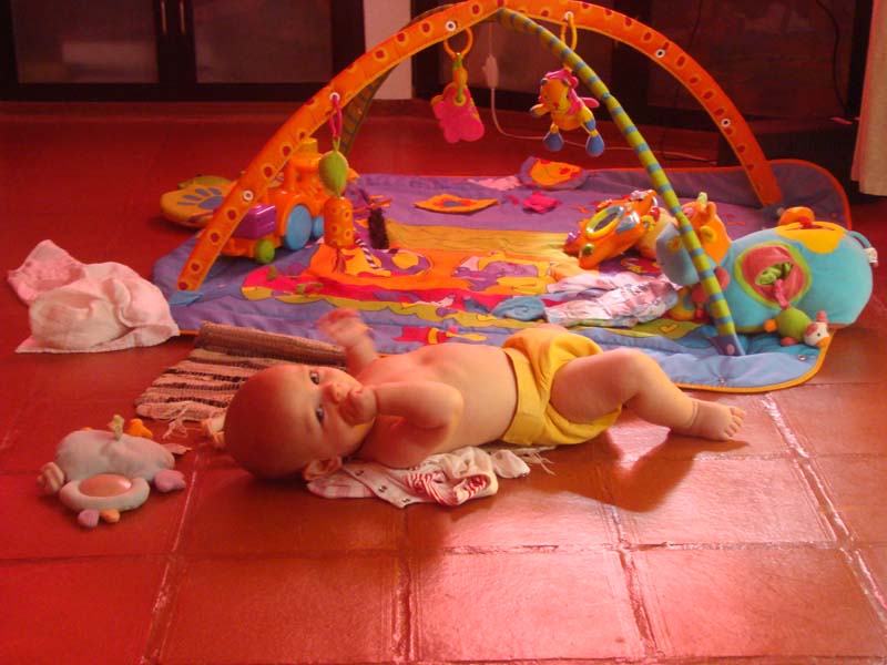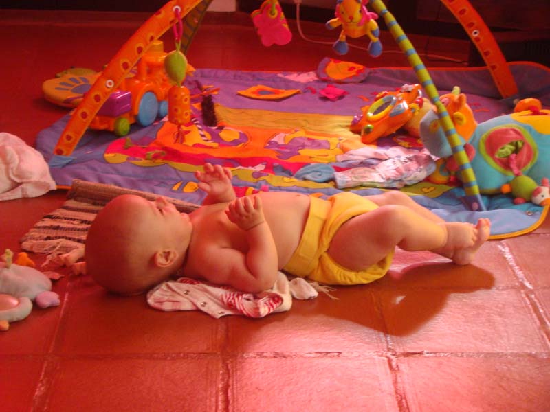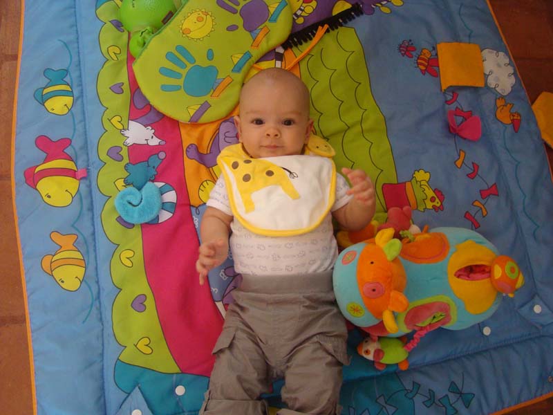 Il n’arrête pas de passer du dos au ventre, et du coup, il se déplace doucement, mais surement! (sur les photos, au debut il était au milieu du tapis…)
