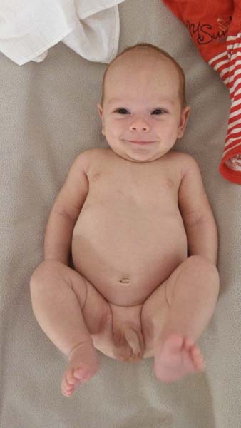 Il est de plus en plus eveille, commence à bien regarder autour de lui et a jouer dans son tapis tout seul!